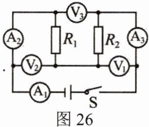 4. 如图26所示电路,三个电压表$V_1$、$V_2$、$V_3的示数分别为U_1$、$U_2$、$U_3$,$V_1和V_3$两个电压表的指针恰好指在同一位置处,三个电流表$A_1$、$A_2$、$A_3的示数分别为I_1$、$I_2$、$I_3$。闭合开关后,则(