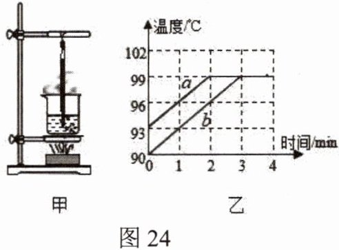2. 小明利用如图24甲所示的装置研究某燃料热值,他取少量燃料置于燃烧皿中,点燃后对100g的热水加热4min,然后立即将其熄灭,测得消耗燃料4.2g,并根据实验数据绘制了水温随时间变化的图象如图24乙中a线所示。已知此过程中燃料均匀燃烧放热,所放出热量只有60%被水吸收。水的比热容为$4.2×10^3J/(kg·℃)$,整个过程中忽略水的质量变化。下列说法中正确的是(