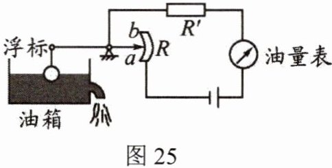 3. 如图25所示是一种自动测定油箱内油面高度的装置,R是滑动变阻器,它的金属滑片是杠杆的一端,且由定位挡板限制只能在电阻上滑动。从油量表指针所指的刻度,就可以知道油箱内油面的高度h。则以下说法正确的是(