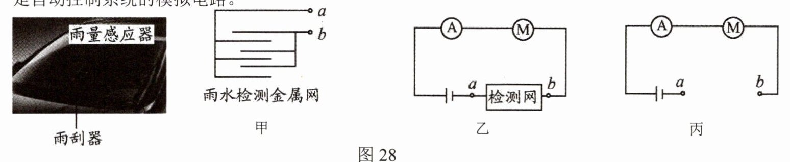 (2)活动小组发现无雨水时,电动机不能工作,无法实现无雨时车窗的清洗,于是增加了一个电路元件改进了电路,将“检测网”和“增加的元件”连入电路ab间,绘制在28图丙中。(答案图略)