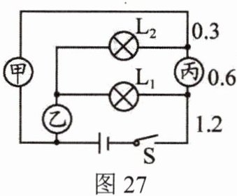 5. 在如图27所示电路中,开关S闭合时,规格相同的灯泡$L_1$、$L_2$均能发光,图中甲、乙、丙为电表,粗心的小明在读数时在纸上记录了3个数字,即3个数字分别对应三个电表的读数,则下列说法正确的是(