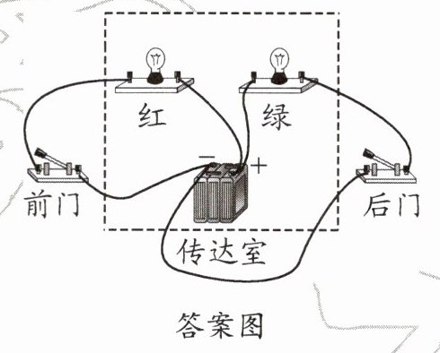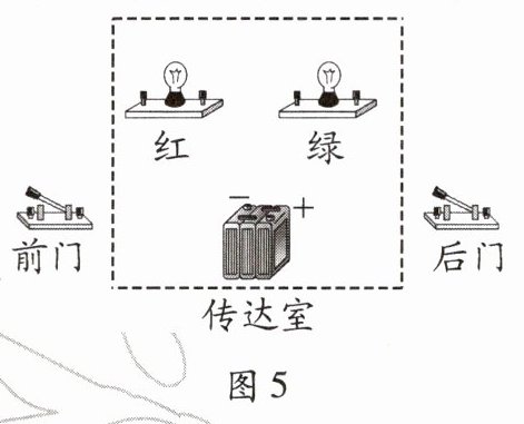 11. (2024·阜阳)如图5所示,学校有前、后两扇门和值班室。在前、后两扇门上各装一个按钮开关,学校值班室里有电池组,以及红、绿两盏灯,若要求前门来人按下开关时红灯亮,后门来人按下开关时绿灯亮,请连接电路(导线不能交叉)。