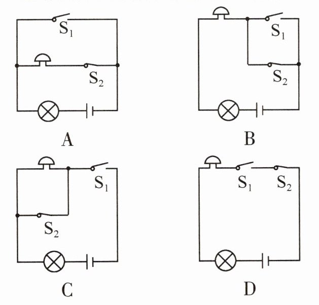 8. (2024·阜南)某实验小组想设计一个用来监测跳远过线犯规现象的电路。当有人踏上踏跳板时,开关S₁、S₂同时闭合,灯亮、铃不响;当机器感应到运动员脚尖过线时,踏跳板旁的红外感应开关S₂断开,电铃发出声音,提醒裁判运动员犯规。下列电路设计图满足上述要求的是(