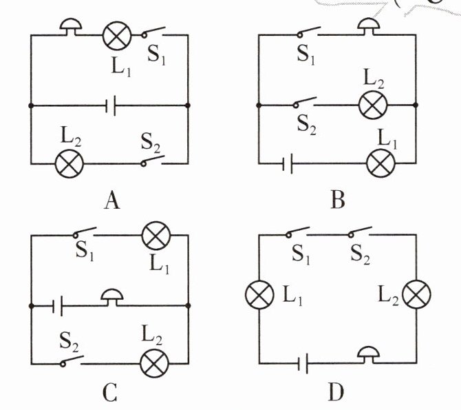 7. (2023·临沂)“中国物流之都”临沂拥有众多仓库,对仓库的管理也规范有序。某仓库分辨前、后门来人的电路为:前门来人闭合开关S₁时,红灯L₁亮、电铃响;后门来人闭合开关S₂时,绿灯L₂亮、电铃响。下列电路设计图中,满足上述要求的是(