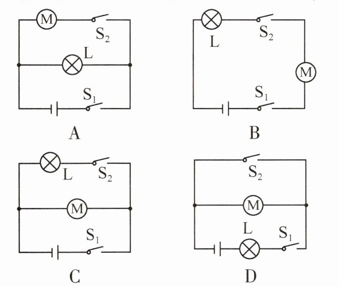 9. (2024·南充)骑共享电动自行车时不戴头盔存在安全隐患,于是小明设计了以下方案:骑共享电动自行车前,扫码成功后开关S₁闭合,指示灯L亮,但电动自行车的电动机不工作;从车头取下头盔并戴上后,头盔内的遥控设备遥控开关S₂闭合,电动机才通电工作。若只戴头盔不扫码,无法骑行共享电动自行车。下列电路设计图符合上述设计要求的是(