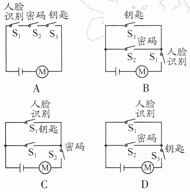 10. (2024·湖南)某科技小组模拟“智能开锁”设计的电路有两种开锁方式,即“人脸识别”与输入“密码”匹配成功,或“人脸识别”与使用“钥匙”匹配成功才可开锁。现用S₁表示人脸识别,S₂、S₃表示密码、钥匙,匹配成功后,对应的开关自动闭合,电动机才工作开锁。下列电路设计图中,满足上述要求的是(