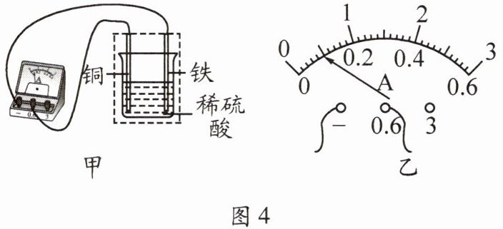 5. 如图甲所示,小明将铁片和铜片插在稀硫酸中,电流表的指针发生偏转,此时指针的位置如图乙所示,则电流大小为