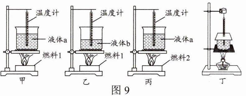 (2)某同学用图丁装置测酒精的热值。加热前酒精灯的质量为$m_1,$加热一段时间后变为$m_2;$烧杯中水的质量为m,水的初温$t_1,$末温$t_2,$水的比热容用c表示。若不考虑热量散失,用以上符号表达该同学测酒精热值的计算式:$_____;$