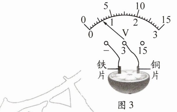 4. (2024·淮安)如图3所示,小明取来一个橙子,把铜片、铁片插入其中,制成一个水果电池。