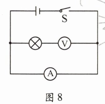 12. 小明用电流表和电压表测通过小灯泡的电流和它两端的电压,实验中不慎将两表位置互换了,如图8所示,则闭合开关后可能会发生的现象是(