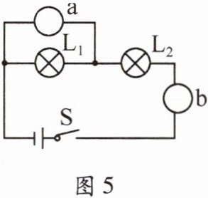 8. 如图5所示的电路,要使L₁与L₂串联,在“○”处接入电流表或电压表,测量电路中的电流或L₁两端的电压。下列判断正确的是(