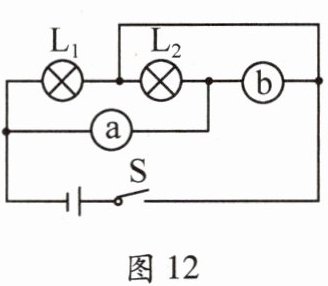 1. 如图12所示,L₁和L₂是两个相同的灯泡,a、b是电流表或电压表。闭合开关S后,两灯都能发光,则下列判断正确的是(