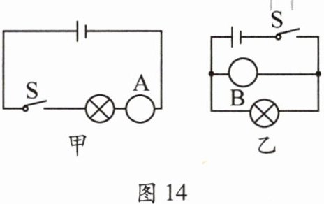 3. 实验室里的电压表和电流表都很旧,表盘上的标志均看不清了。为知道两个电表的种类,小玉设计了如下实验:将两个电表分别与完好的灯泡串联和并联接入电路,如图14所示。当闭合开关S时,与电表A串联在一起的小灯泡没有亮,但电表的指针有很大幅度的偏转;与电表B并联的小灯泡也没有亮,电表指针的偏转幅度很大。