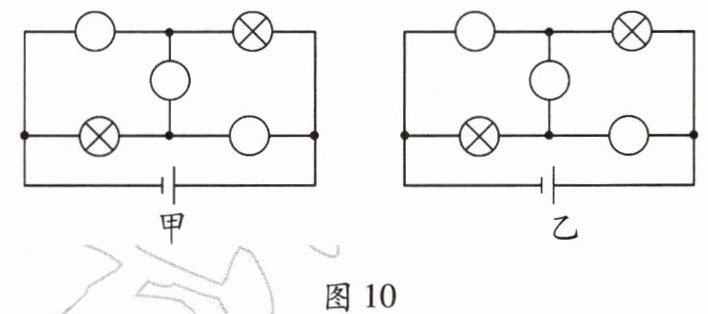 14. 请在如图10所示的两图的圆圈中填上电压表或电流表的符号,使之成为两个不同连接关系的电路。要求两个灯泡都能发光,且两电表的示数均不为零。
