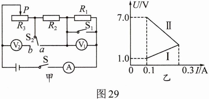 7. 如图所示电路,电源电压U保持不变,$R_1和R_2$为定值电阻,$R_3$为滑动变阻器。开关S闭合、$S_1$断开、$S_2$置于a时,调节滑动变阻器,电压表$V_1$的示数与电流表A的示数关系图线如图乙中的Ⅰ所示;开关S和$S_1$闭合、$S_2$置于b时,调节滑动变阻器,电压表$V_2$的示数与电流表A的示数关系图线如图29乙中的Ⅱ所示。求: