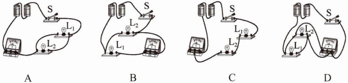 7. 下列“用电流表测量电流”的实验电路中,能正确测出小灯泡$L_1$中电流的是(