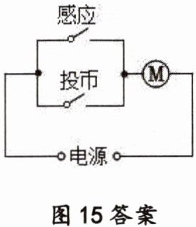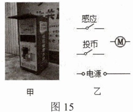 26. 某款售水机(如图15甲所示)可通过刷卡(闭合“感应”开关)或投币(闭合“投币”开关)接通供水电机取水;用给出的元件符号在图15乙中画出符合要求的电路图。_____