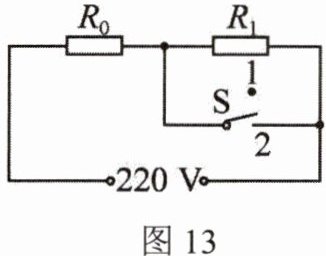 24. 有一种电热水壶常有两个档,分别是“烧水”和“保温”,其内部的简化电路图如图13所示,已知$R₀=55Ω,R_1=1045Ω,$当S接1时,电热水壶处于