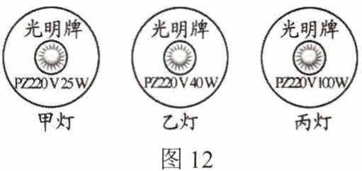 23. 小勇家中有三只如图12所示的白炽电灯,甲灯标有“PZ 220V 25W”,乙灯标有“PZ 220V 40W”,丙灯标有“PZ 220V 100W”,当三灯均正常发光时,不考虑灯丝电阻的变化,最亮的灯是