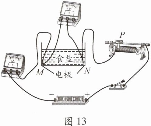 2. 物理小组想探究导电液体的导电性与接入电路中的液体横截面面积大小的关系。他们利用长方体水槽、浓度一定的食盐水、电源、滑动变阻器、电压表及电流表等器材进行了探究,连接的实验电路如图13所示。实验时,小组同学将电极M、N分别固定在水槽左、右两侧底部的中央。