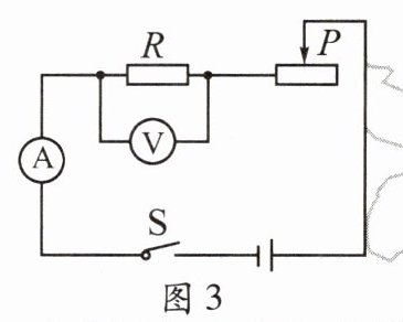 6. 在探究电流与电阻的关系时,实验室准备了阻值分别为5Ω、10Ω、20Ω的电阻。当将5Ω的电阻接在图3中R所在的位置时,调节滑动变阻器的滑片P,使电压表V的示数为2 V;再分别用10Ω、20Ω的电阻替换5Ω的电阻进行实验。下列说法正确的是 (