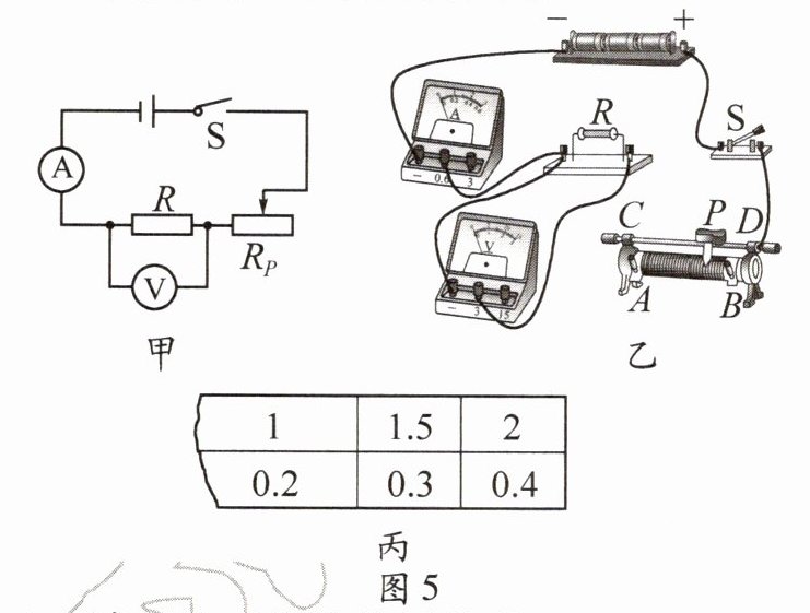 (1)请用笔画线代替导线将图5乙所示的实物电路连接完整。要求:将滑动变阻器的滑片P向右移动时,电流表的示数变小。