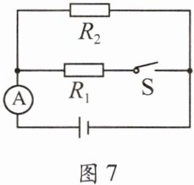 10. (2024·北京)在如图7所示的电路中,电源电压恒定,R₁=4R₂。当开关S断开时,电流表的示数为I₁;当开关S闭合时,电流表的示数为I₂。由此可得,I₁:I₂等于 (