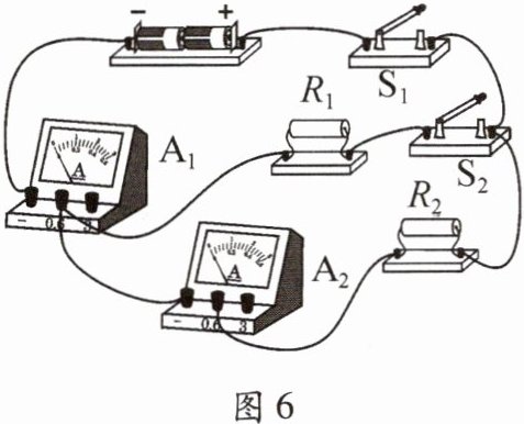 9. 如图6所示的电路,开关S₁、S₂闭合时,电流表A₁的示数为0.5 A,电流表A₂的示数为0.3 A,电阻R₂的阻值为10 Ω。下列说法正确的是 (