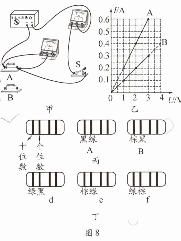 Ω。在工程技术领域,常用不同的色环对电阻进行标记,两位数以内的电阻值可以根据前两环的颜色来判断,色环含义及导体A、B的色环如图8丙所示。若还需用到一个15 Ω的电阻,应选用图8丁中的电阻e