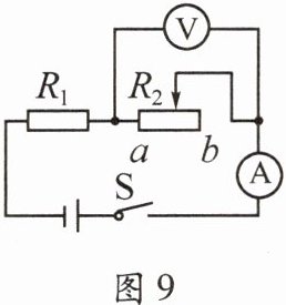 12. (2023·重庆)在如图9所示的电路中,电源电压保持不变。电阻R₁的阻值为30 Ω,滑动变阻器R₂上标有“60 Ω 0.5 A”的字样。闭合开关S,滑动变阻器R₂的滑片位于b端时,电流表的示数为0.2 A。求: