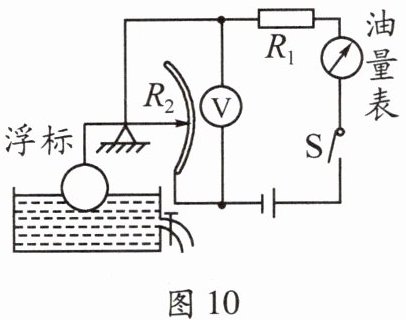 1. 图10所示是一种自动测定油箱内油面高度的装置,R₁是定值电阻,R₂是滑动变阻器。下列说法不正确的是 (