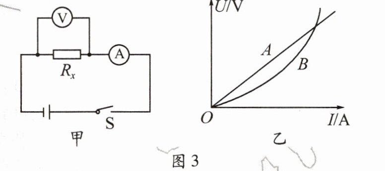 。小组同学利用改进后的电路进行实验,并绘制出Rx的电压一电流图像。如图3乙所示的A、B两条图线中,A