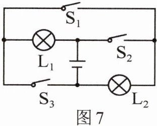 )A. 只闭合$S_1$时,灯$L_1、$$L_2$串联B. 只闭合$S_2、$$S_3$时,灯$L_1、$$L_2$并联C. 只闭合$S_1、$$S_2$时,只有灯$L_1$发光D. 同时闭合$S_1、$$S_2、$$S_3$时$,L_1、$$L_2$都不发光