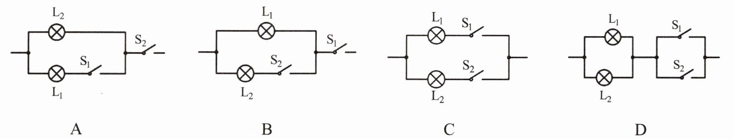 7.(2023•安徽)老师给小龙一个密封盒,其表面可见两个开关$S_1、$$S_2$和两盏灯$L_1、$$L_2。$为了探究开关和灯在密封盒内是如何连接的,小龙进行了如下操作:先闭合$S_1,$只有灯$L_1$发光;又闭合$S_2,$两灯都发光;再断开$S_1,$两灯都熄灭。符合上述实验结果的连接方式为(
