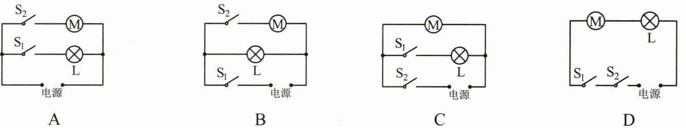 9.(2024•重庆)家用电动窗帘的电路主要由电源指示灯L和电动机M组成。先闭合开关$S_1,$电源指示灯L亮;再闭合开关$S_2,$电动机M工作拉动窗帘。当$S_1$断开时,电动机M不能工作。下列电路中符合要求的是(