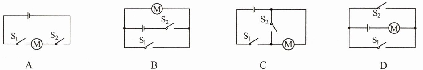 8.(2024•泰安)小文同学家安装了密码门锁,能通过输入密码$(S_1)$或利用钥匙$(S_2)$单独驱动电动机工作而打开门锁。下列电路设计符合要求的是(