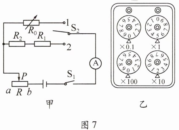(3)断开开关S₁,再将开关S₂接“1”触点,保持滑动变阻器R的滑片P的位置不变,闭合开关S₁,调节电阻箱R₀的阻值,如图7乙所示,使电流表的示数仍为I,则串联电路的等效电阻是