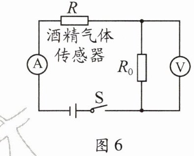 11. (2024·广州)图6所示是酒精浓度检测仪的简化电路图,其中R₀为定值电阻,R为酒精气体传感器,R的电阻值随酒精气体浓度的增大而减小。如果驾驶员对着酒精气体传感器呼出的酒精气体浓度越大,下列说法正确的是(