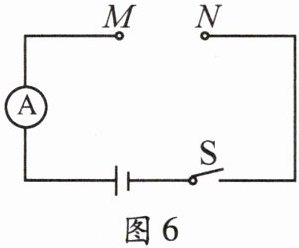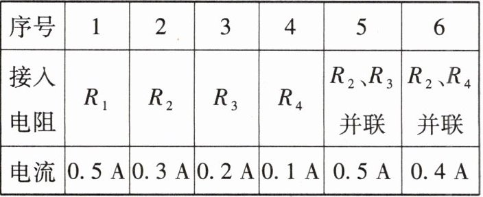 12. 为探究导体并联时的电阻规律,某同学将阻值不等的R₁、R₂、R₃、R₄按照不同方式先后接入图6所示电路中的M、N两点之间,每次实验中闭合开关后,记录的电流表示数如下表所示。