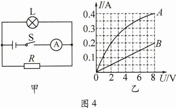 )A.图4乙中的曲线A表示电阻R的I-U关系