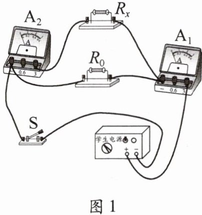 1. 为了测量未知电阻$R_x$的阻值,小斐利用两个电流表、阻值已知的电阻$R_0$和符合实验要求的器材,设计了如图1所示的实验电路。闭合开关后,电流表$A_1$的示数为$I_1$,电流表$A_2$的示数为$I_2$。请根据已知量和测量量写出$R_x$的表达式:$R_x=$