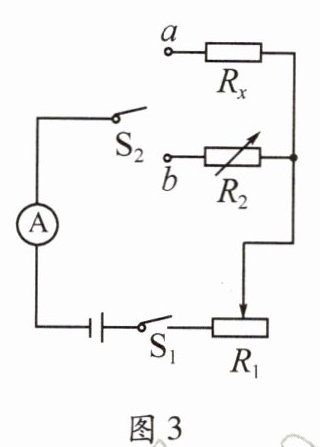 3. (2024·武威)小文运用等效思想测电阻$R_x$的阻值,设计的电路如图3所示,其中$R_2$是电阻箱。小文的测量步骤如下,其中错误的步骤是 (