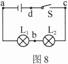 14.如图8所示,闭合开关S时,小电灯$L_1、$$L_2$都不亮,用一段导线的两端接触a、b两点时,两灯都不亮;接触b、c两点时,两灯都不亮;接触c、d两点时,两灯都亮,对此,下列判断中正确的是(