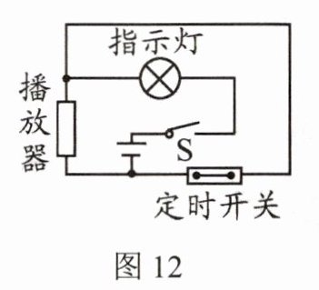19.如图12所示是一种定时课间音乐播放装置的原理图。“播放器”是有电流通过时会播放音乐的装置;“定时开关”是到达设定时间,自动断开的开关。闭合开关S,当“定时开关”处于闭合状态时,指示灯