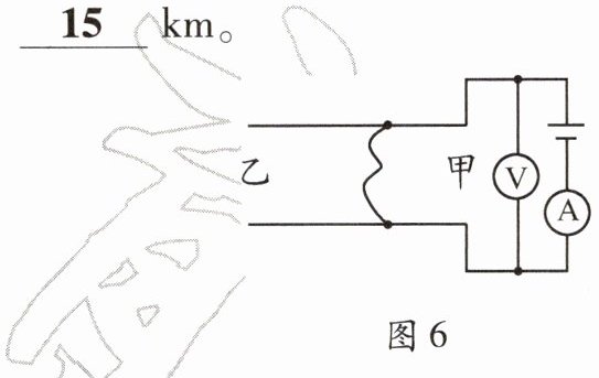 7. (2024·大连)甲、乙两地相距50km,在甲、乙两地之间沿直线架设了两条输电线,已知每条输电线每千米的电阻为0.2Ω。现输电线的某处发生了短路,为确认短路位置,检修员在甲地利用电压表、电流表和电源接成如图6所示的电路进行测量。当电压表的示数为6.0V时,电流表的示数为1.0A,则接入该电路的输电线的电阻为