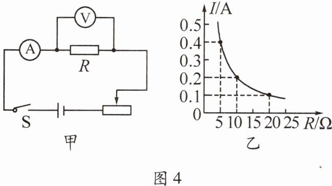 4. (2024·南京)小明在探究电流与电压的关系时,设计了如图4甲所示的电路,其中电源电压为6V且保持不变,R是阻值为5Ω为定值电阻。