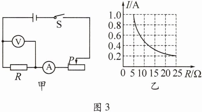 3. 小宇在探究导体中的电流与导体电阻的关系时,设计了图3甲所示的电路,图3乙所示是根据测量数据绘制的图像。实验中,当他把10Ω的定值电阻换成15Ω的定值电阻时,应将滑动变阻器的滑片P向