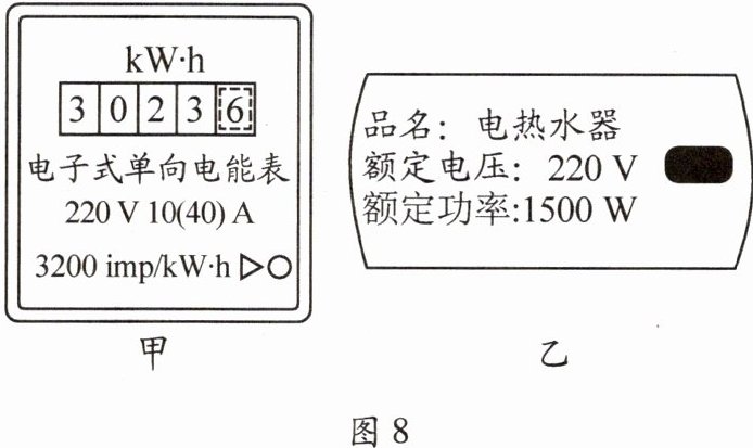 kW·h。小明将如图8乙所示的电热水器单独接入家庭电路工作,观察到电能表的指示灯在1 min内闪烁了80次,则该电热水器在1 min内消耗的电能为 9.0×10⁴