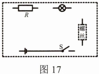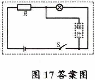 24.高铁轨道中的螺丝会因震动而松动,引发安全隐患。创新小组的同学们设计了一个检测螺丝松动的报警方案电路图。其工作原理是:螺丝(相当于一段导线)正常连接时,报警灯不亮;当螺丝松动时(相当于该导线断开),此时报警灯亮起提醒工人及时维修。请在方框内用直线连接(如图17所示)的电路元件(R是保护电路的元件)。_____