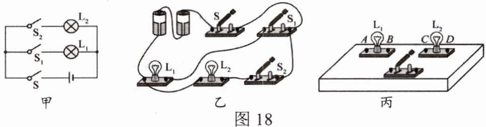 (2)他将所有开关闭合,发现$S_1$支路的灯$L_1$不亮$,S_2$支路的灯$L_2$发光。他又断开所有开关,交换两灯位置后,再闭合所有开关,发现仍然是$S_1$支路的灯不亮$,S_2$支路的灯发光,则故障原因可能是$_____(合理即可)。(3)他排除故障后,继续进行实验,为了探究开关$S_1$的作用,在观察灯泡发光情况时,他应该观察$_____($选填$“S_1”“S_2”$或$“S_1$和$S_2”)$所在支路上的灯泡。(4)若用一根导线将灯$L_1$两端连接,灯$L_2$将_____(选填“亮”“不亮”或“烧坏”)。(5)一个有盖木盒如图18丙所示(导线的连接情况隐藏在盒内),当闭合开关时,两只小灯泡都亮了,拧去灯泡$L_1$灯泡$L_2$仍然发光,则两个灯泡的连接方式是_____。
